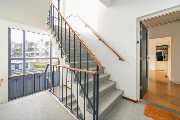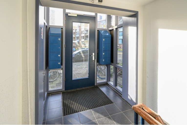 Afgesloten entree met brievenbussen/bellentableau, trap naar 1e verdieping.