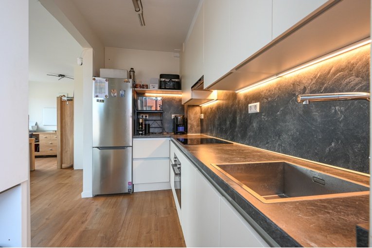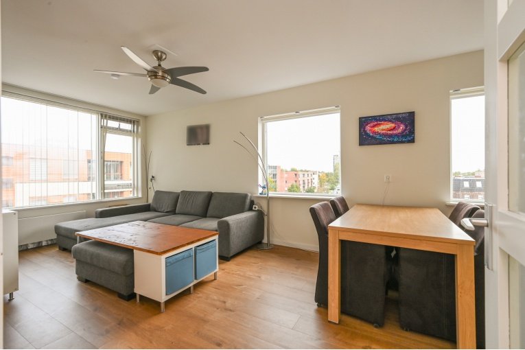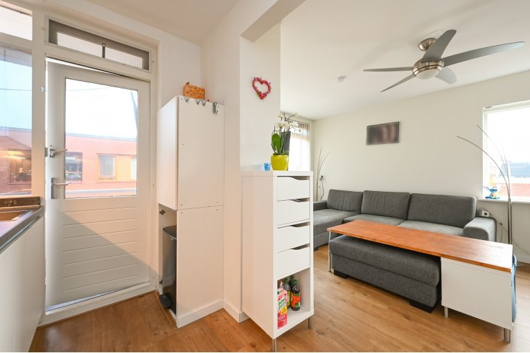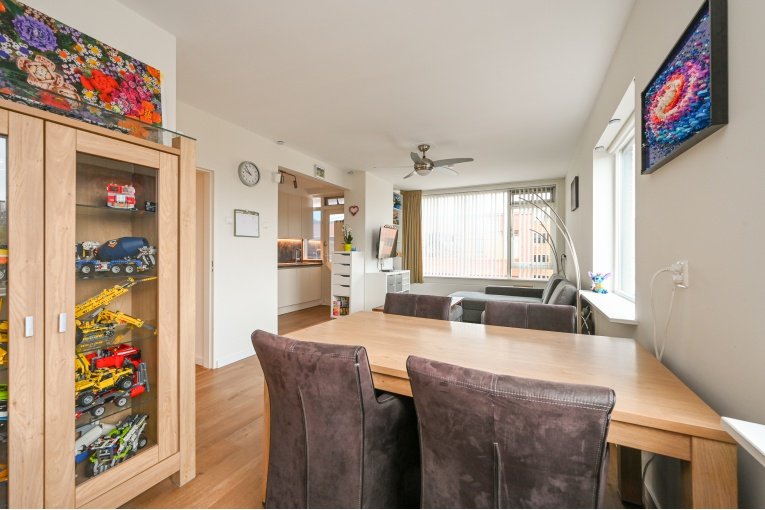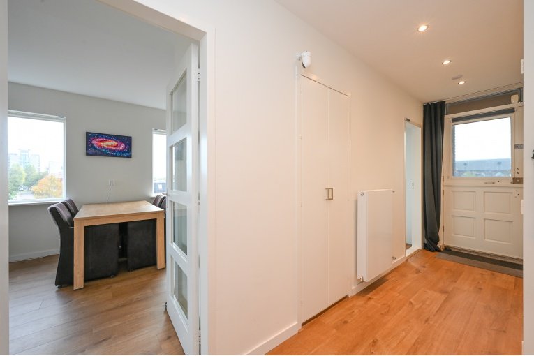 Galerij. Entree woning. Ruime hal met de meterkast en inloopkast. Nette toiletruimte. Moderne badkamer met inloopdouche en wastafel. Zeer lichte woon-/eetkamer met toegang tot de half open moderne keuken, die is voorzien van een modern L-vormig keukenblok met diverse inbouwapparatuur (koel -/vriescombinatie, inductie kookplaat, afzuigkap, combimagnetron-oven vaatwasser). Vanuit de keuken toegang tot het balkon (noordwest, middag-/ en avondzon). Voorslaapkamer. Voor-zijslaapkamer. Achter-zijslaapkamer met vaste kast voorzien van C.V.- ketel en wasmachine aansluiting. In de onderbouw een eigen berging.