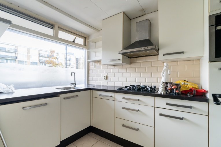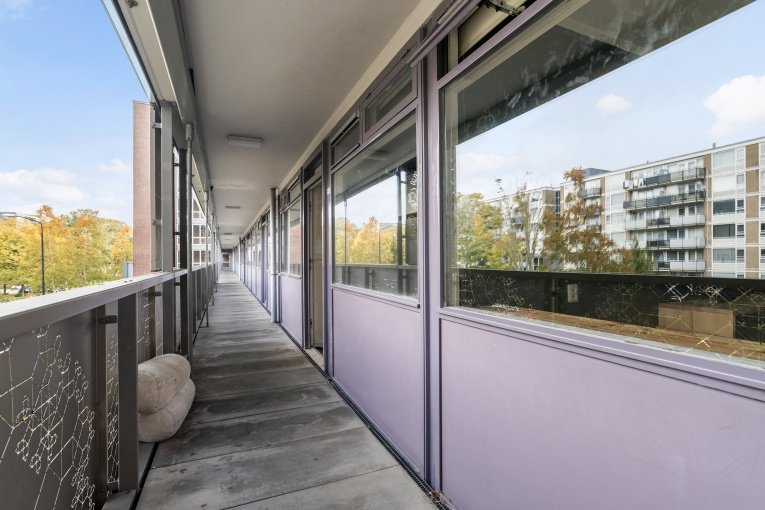 Fraaie, ruim en afgesloten entree met bellentableau, trappenhuis en lift; via de galerij komt u bij de appartementen. 4- kamer appartement (3 slaapkamers) op de 2e verdieping met ruim zonnig balkon en eigen (fietsen)berging: