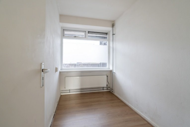Entree appartement, gang met eenvoudig toilet, ruime achterslaapkamer, eenvoudige badkamer met inloopdouche, wastafel en opstelplaats wasmachine/droger, ruime lichte woonkamer, 2e slaapkamer aan de voorzijde (voormalig 3e slaapkamer is nu in gebruik als eetkamer), eenvoudig keuken en toegang naar bergkast met opstelplaats c.v. ketel.