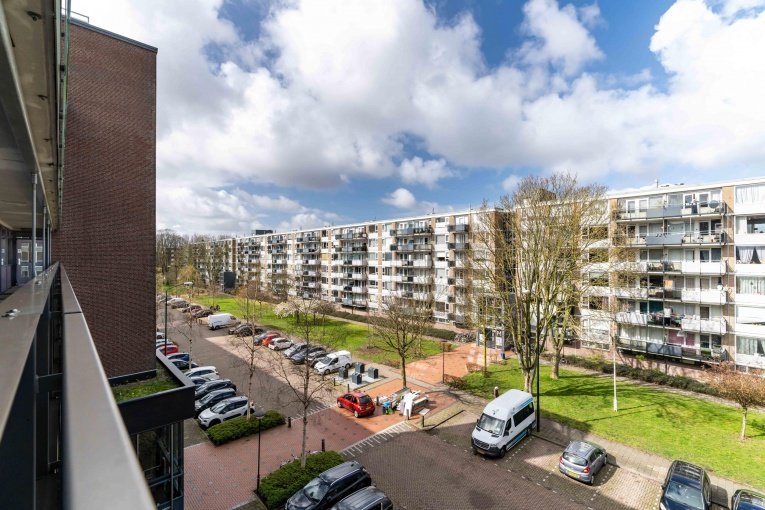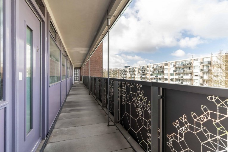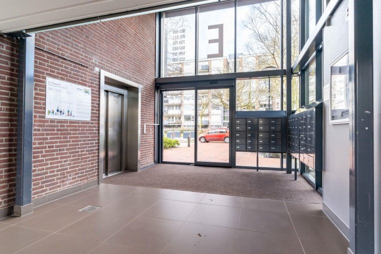 Fraaie, ruim en afgesloten entree met bellentableau, trappenhuis en lift; via de galerij komt u bij de appartementen. 4- kamer appartement (3 slaapkamers) op de 4e verdieping met ruim zonnig balkon en eigen (fietsen)berging.