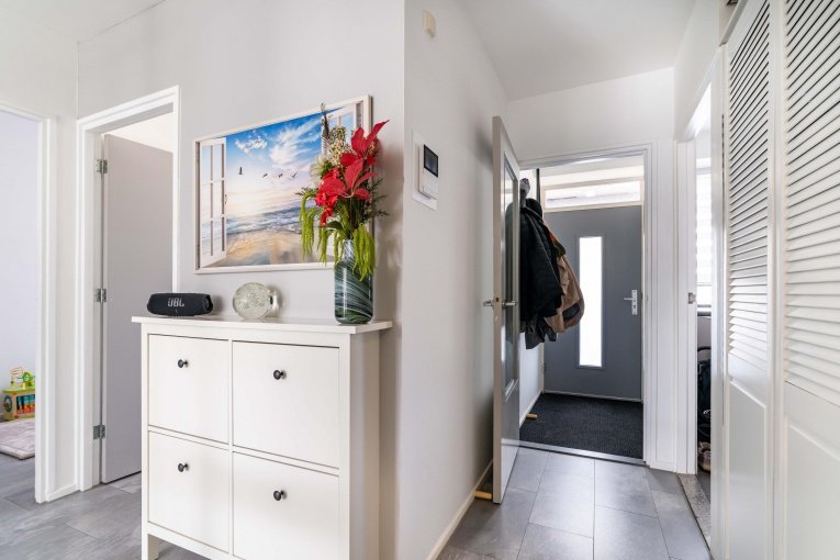Entree appartement, gang met modern toilet, ruime achterslaapkamer, moderne badkamer met inloopdouche, wastafelmeubel en opstelplaats wasmachine/droger, ruime lichte woonkamer, twee slaapkamers aan de voorzijde, moderne keuken en toegang naar bergkast met opstelplaats c.v. ketel.