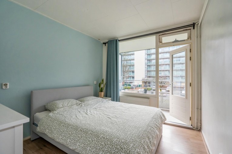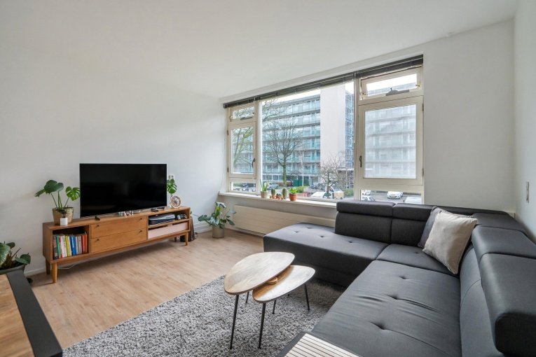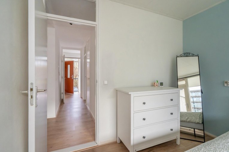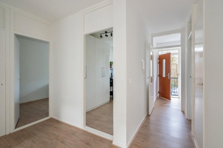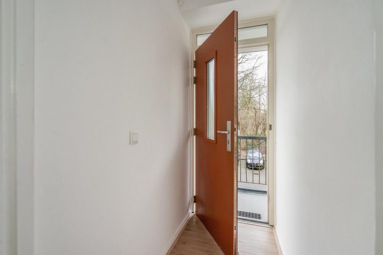 Entree, tochtportaal, gang, moderne keuken in L-opstelling voorzien van een hardstenen werkblad en diverse inbouwapparatuur (4-pits gaskookplaat, afzuigkap, oven, koel- en vrieskast, vaatwasser). Modern vrijdragend toilet. Moderne badkamer met inloopdouche en wastafelmeubel. Ruime woonkamer. Voorslaapkamer met toegang tot het balkon. Voorslaapkamer en voorzijslaapkamer. Eigen berging op de begane grond.