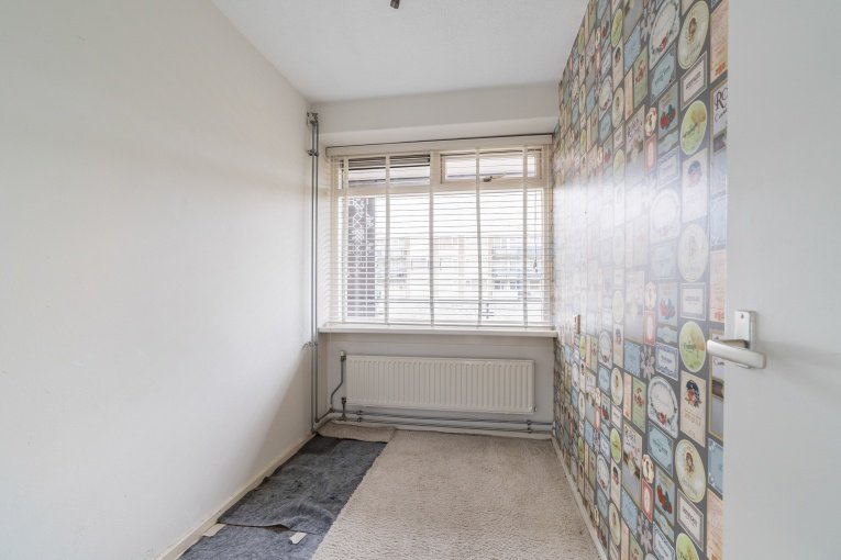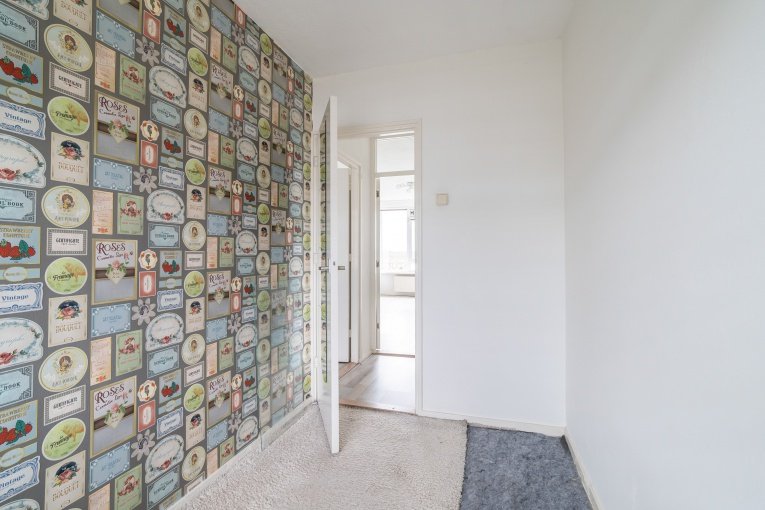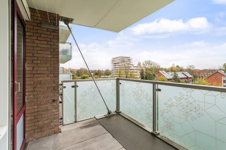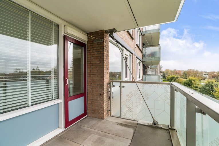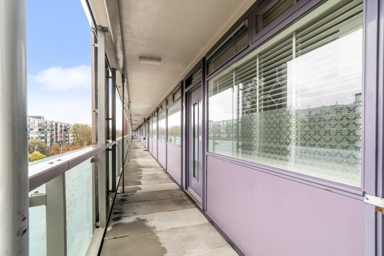 Fraaie, ruim en afgesloten entree met bellentableau, trappenhuis en lift; via de galerij komt u bij de appartementen. 4- kamer appartement (3 slaapkamers) op de 4e verdieping met ruim zonnig balkon en eigen (fietsen)berging: