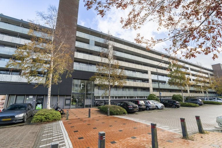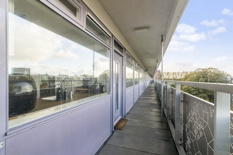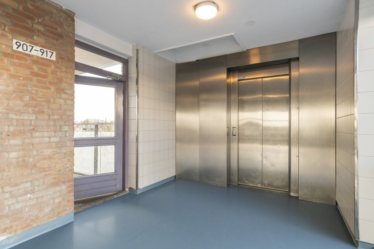 Fraaie, ruim en afgesloten entree met bellentableau, trappenhuis en lift; via de galerij komt u bij de appartementen. 4- kamer appartement (3 slaapkamers) op de 6e verdieping met ruim zonnig balkon en eigen (fietsen)berging: