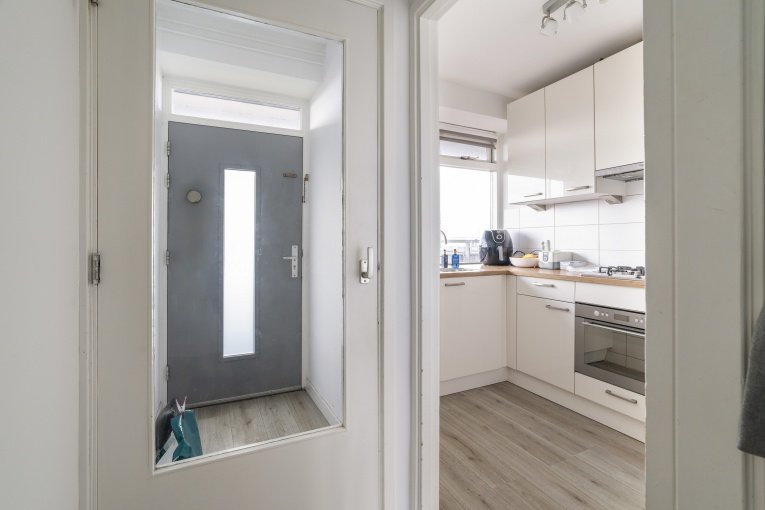Entree appartement, gang met modern toilet, moderne badkamer met inloopdouche, wastafelmeubel, ruime woonkamer, ruime slaapkamer aan de voorzijde, moderne keuken voorzien van divers inbouwapparatuur en toegang naar bergkast met opstelplaats c.v. ketel.