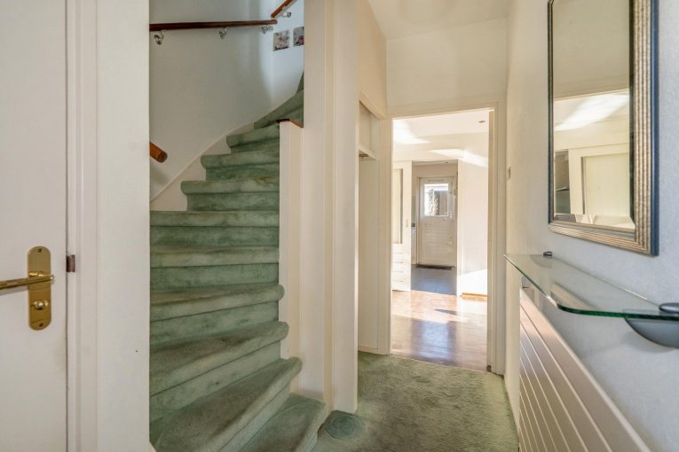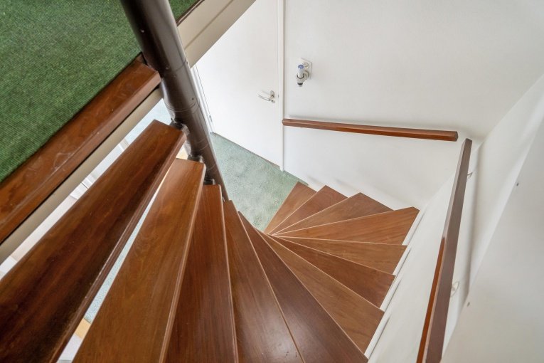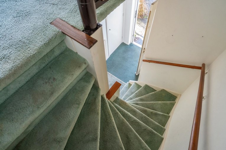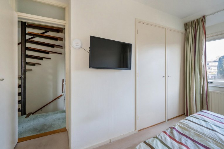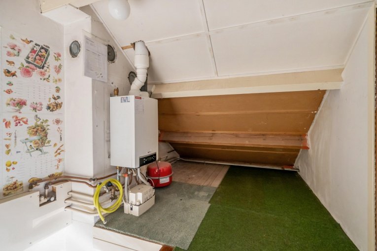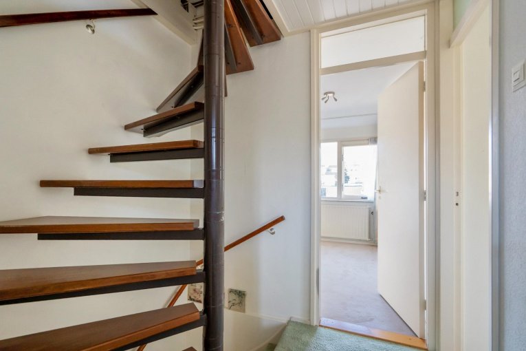 Vaste trap naar de zolderruimte met de opstelplaats C.V.-ketel. De zolder is net geen stahoogte (ca. 1.59 cm hoog). Nok verhoging is in de straat al vaak toegepast.