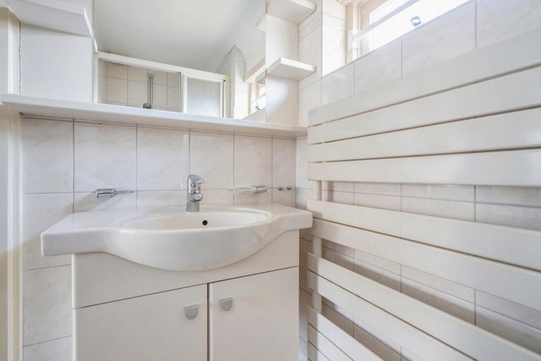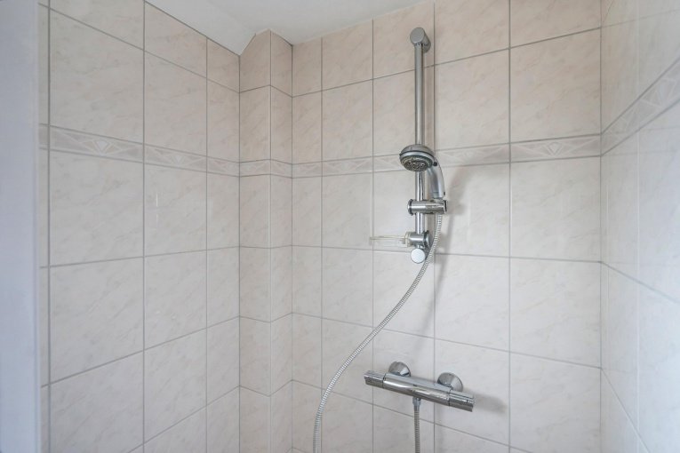 Overloop. Ruime voorslaapkamer. Royale achterslaapkamer. Achterzijslaapkamer. Eenvoudig moderne badkamer met douche en wastafel.