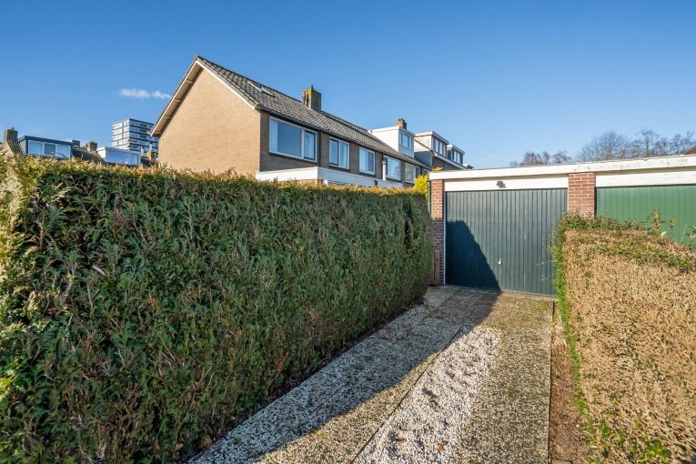 De garage is achter de woning gelegen met eigen oprit en via de tuin of via de straat te bereiken.