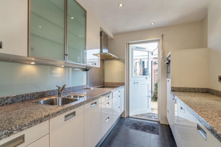 Voortuin. Entree. Hal met meterkast, bergruimte onder de trap en eenvoudig modern toilet met fonteintje. Lichte uitgebouwde woon-/eetkamer met zijraam en dichte uitgebouwde moderne keuken met fraai stenen blad en voorzien van diverse inbouwapparatuur (kookplaat, afzuigkap, magnetron, oven, vaatwasser, koelkast, wasmachine). De schuifpui in de woonkamer geeft u toegang tot de zonnige ruime tuin. Vanuit de tuin heeft u toegang tot de ruime garage welke is voorzien van elektra en elektrische garagedeur. Zowel voor als in de garage is er mogelijkheid tot het parkeren van een auto op eigen terrein.