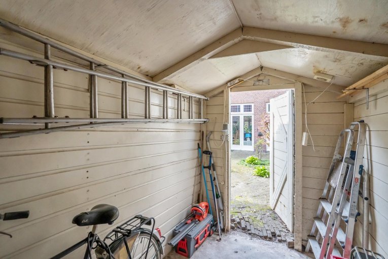 Voortuin (ZW), entree in tochtportaal met meterkast. Ruime woon-/eetkamer met openhaard, half open keuken met inbouwapparatuur en middels openslaande deuren toegang tot de achtertuin (NO). In de achtertuin bevindt zich nog een berging.
