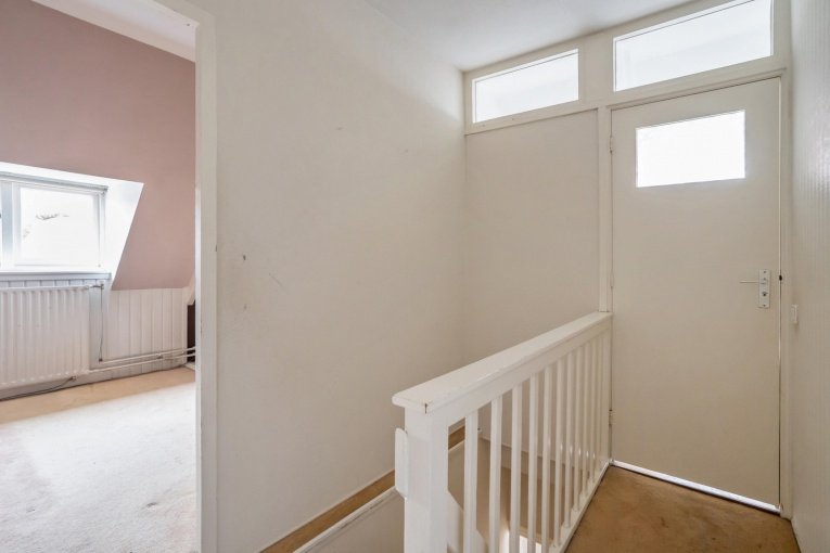 Overloop. Eenvoudig toilet. Eenvoudige badkamer met wastafelmeubel, douche en ligbad. Ruime slaapkamer aan de voorzijde met vaste kast. Royale achterslaapkamer. Achterslaapkamer welke ideaal te gebruiken is als thuiswerkplek.