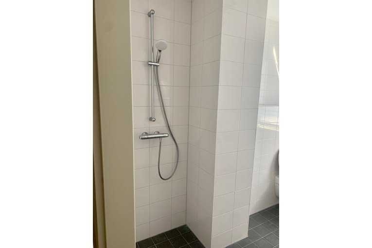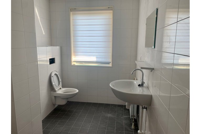Trap naar 1e etage, 2 slaapkamers, nette badkamer met douche, wastafel, en 2e toilet.