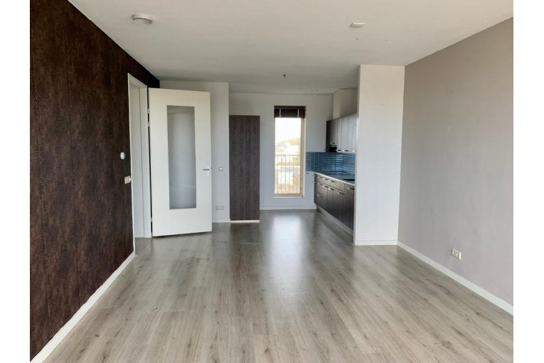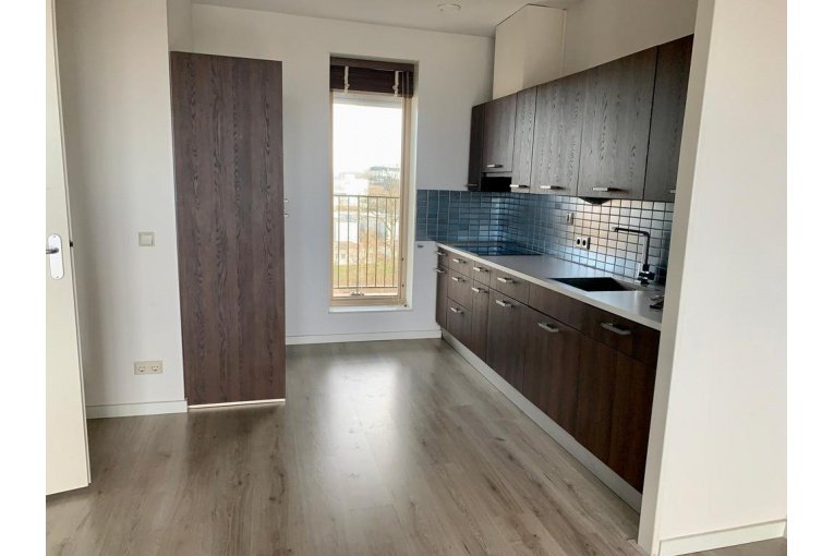 Ruime woonkamer met met vloerverwarming, toegang tot het balkon. Moderne open keuken (aanwezige apparatuur is voor onderhoud van huurder).