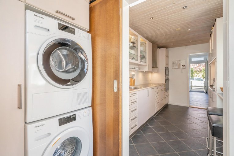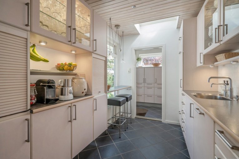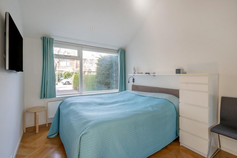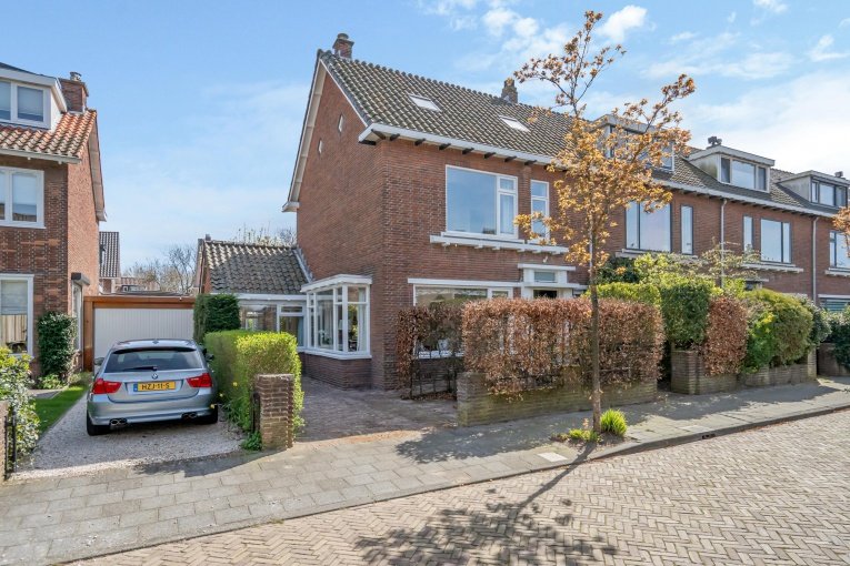 Voortuin. Parkeerplaats op eigen terrein. Entree woning. Ruime hal met meterkast, garderobe kast, trapkast en modern toilet met fonteintje. Lichte en gezellige woon-/eetkamer met voor- en zijerker, mooie parketvloer en toegang tot de zonnige achtertuin. Ruime en nette keuken met verschillende inbouwapparatuur, waaronder een inductiekookplaat, afzuiging, magnetron, oven, koelkast, vriezer, vaatwasser en Quooker. Bijkeuken met wasmachine, droger en veel bergruimte met toegang tot de achtertuin. Zonnige en fraai aangelegde achtertuin met overdekte loungehoek, schuren en achteringang. De garage is handig verbouwd naar een via de woonkamer te bereiken slaapkamer en eigen badkamer met douche, wastafel, toilet en vloerverwarming.