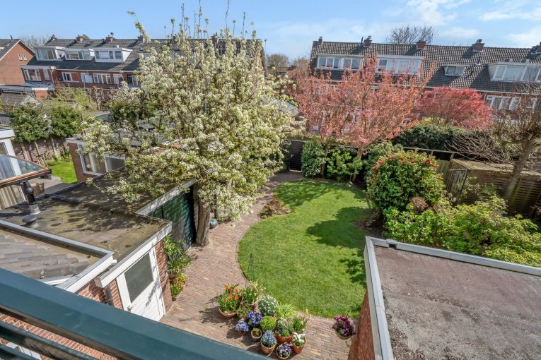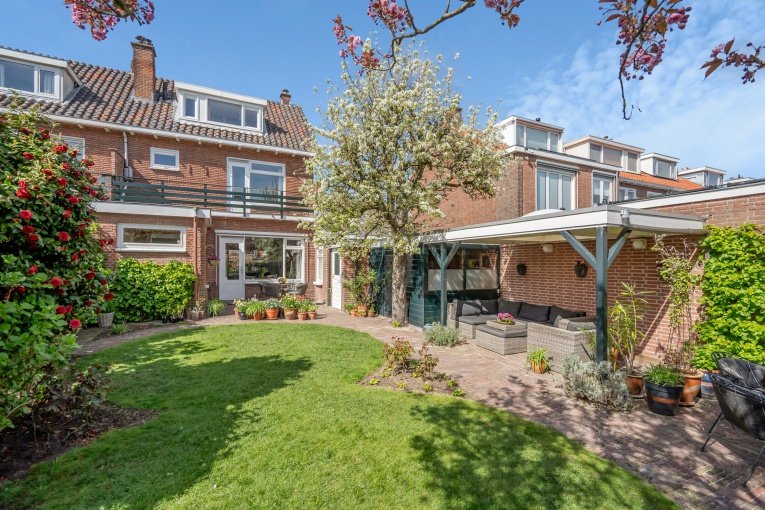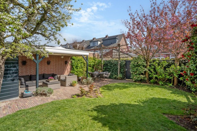- Fraaie en zonnige achtertuin met schuren, overkapping en achteringang;