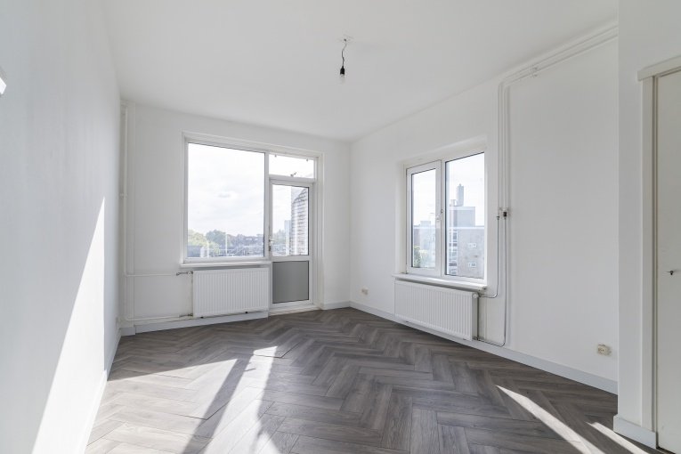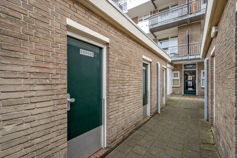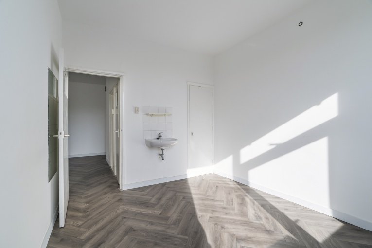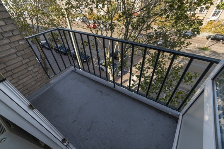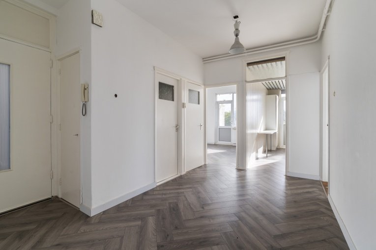 Entree woning, ruime hal met meterkast, ruime en lichte woonkamer, ruim zonnig achterbalkon ZW, eenvoudig dichte keuken, hoofdslaapkamer aan de achterzijde, separaat toilet, badkamer met douche en wastafel, voormalig 2e slaapkamer aan de voorzijde, voorbalkon.
