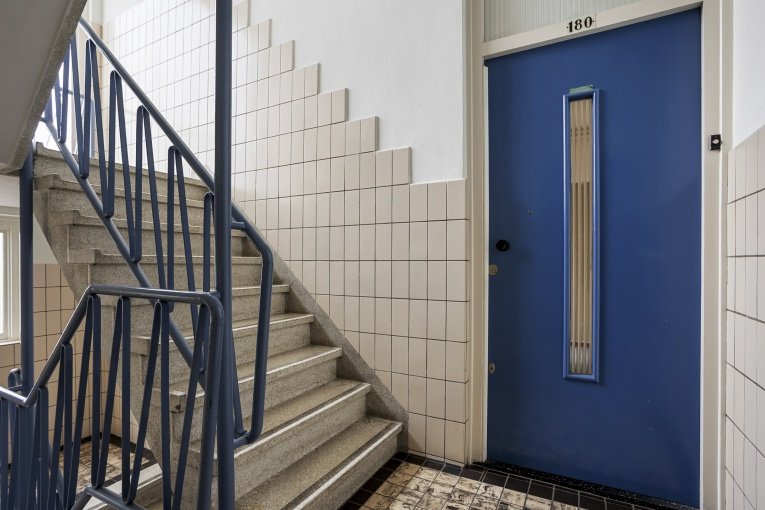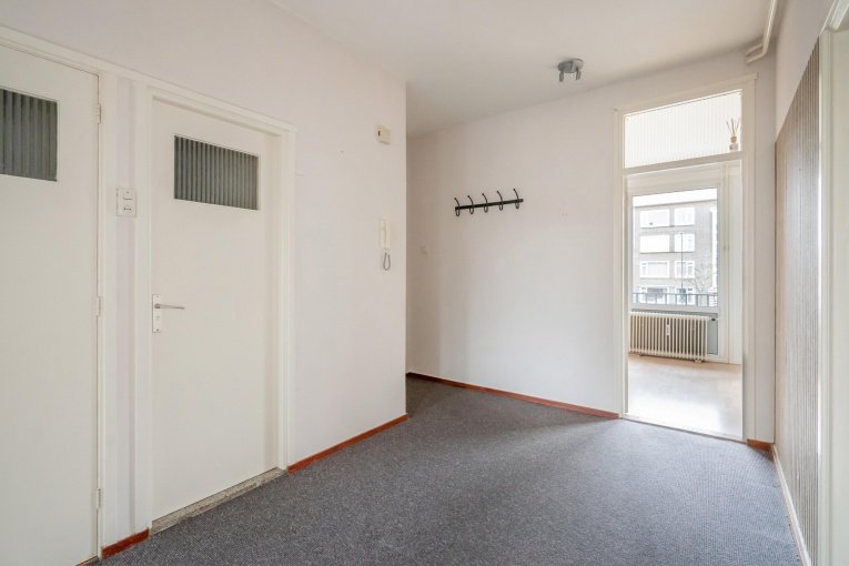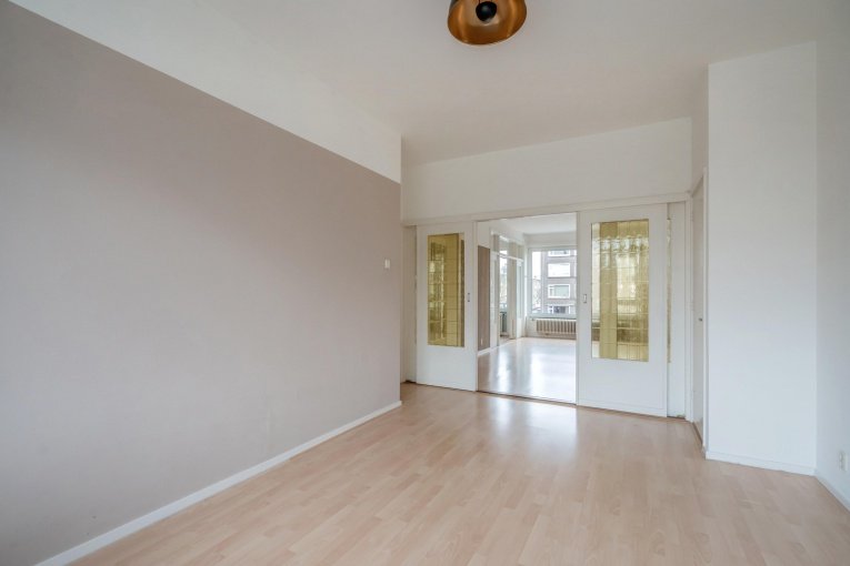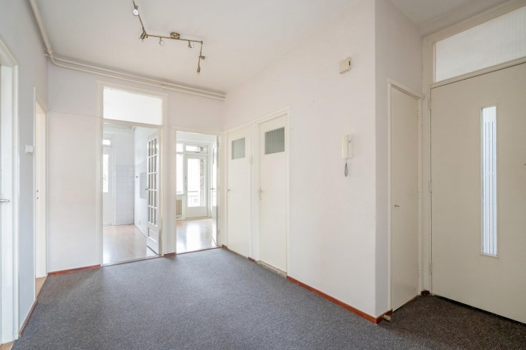 Het appartement is bereikbaar via het nette en ruime trappenhuis. Bij binnenkomst valt direct de royale centrale hal op, die zorgt voor een prettige indeling en een ruimtelijk gevoel. Vanuit de hal zijn alle vertrekken direct te bereiken. Tussen de woonkamer en aangrenzende vertrekken zijn sfeervolle schuifdeuren met gekleurd glas, waardoor de ruimtes zowel open als afsluitbaar zijn. Dit geeft het appartement een karakteristieke en warme uitstraling.