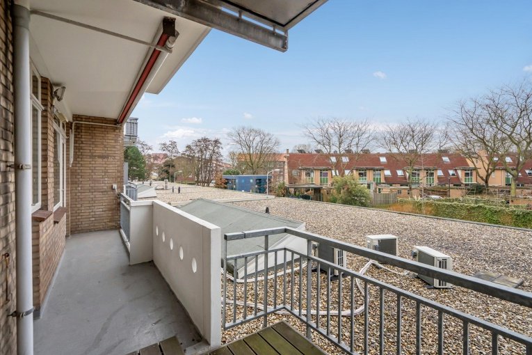De twee slaapkamers en de keuken hebben toegang tot het brede achterbalkon met uitzicht over de groen voorziening aan de achterzijde, waar u tot laat in de avond al borrelend van de zon kunt genieten. Hier vindt u ook een handige balkonkast voor extra opbergruimte.