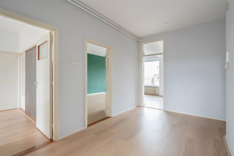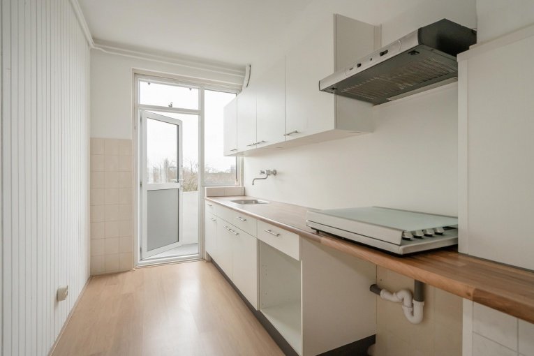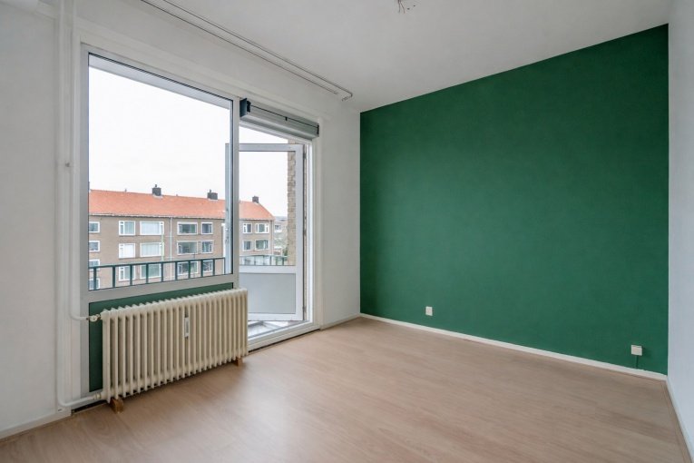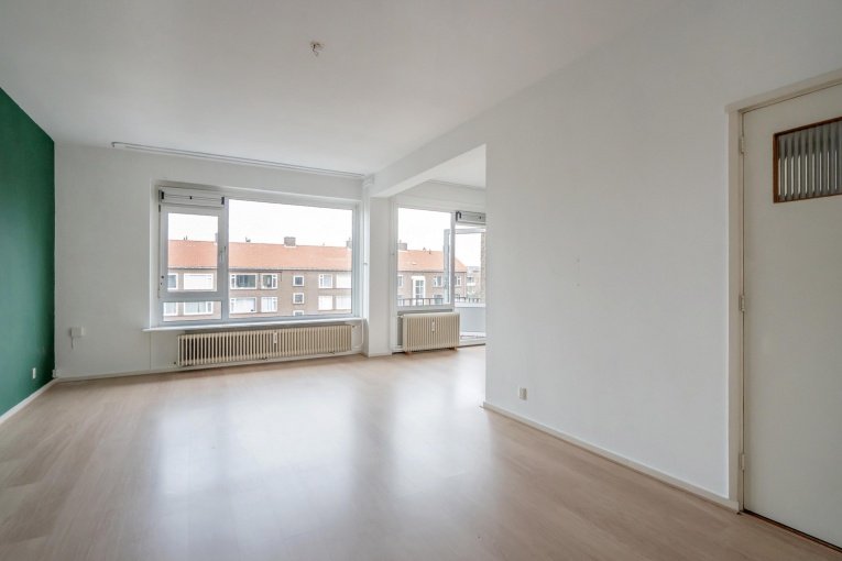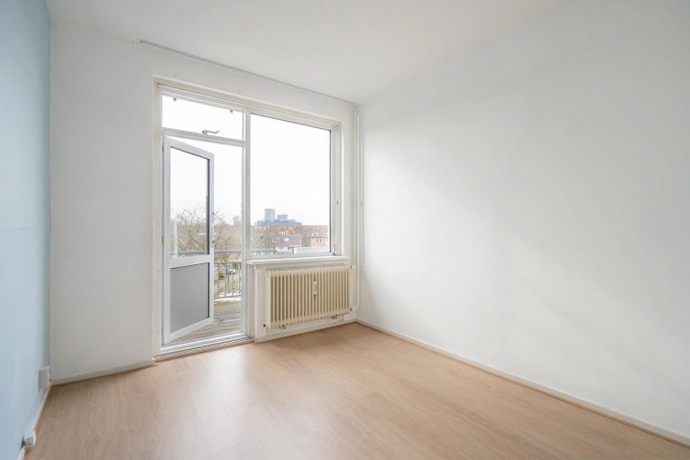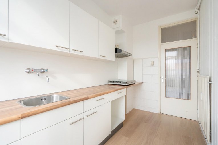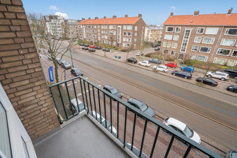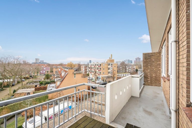 The two bedrooms and the kitchen give access to the wide rear balcony with views of The Hague's skyline, where you can enjoy the sun with drinks until late in the evening. Here you'll also find a handy balcony cupboard for extra storage.