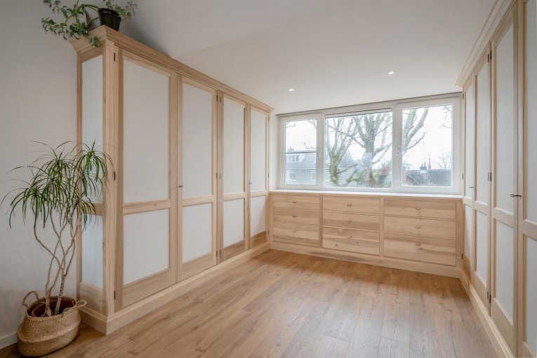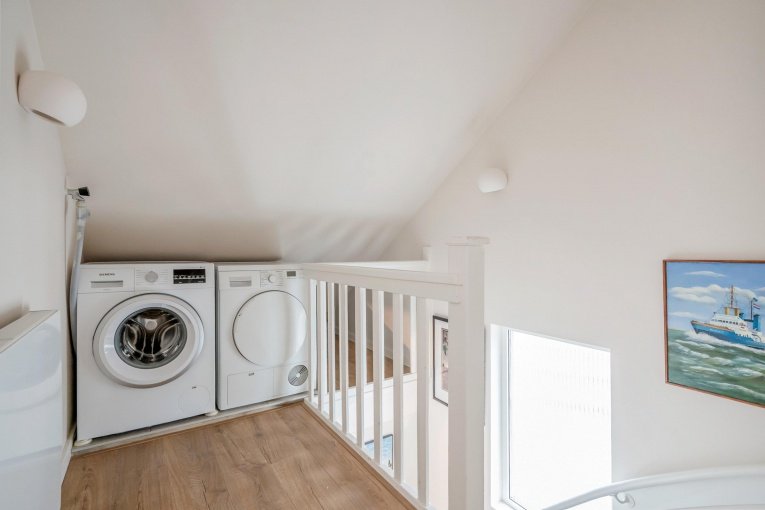Overloop voorzien van opstelplaats wasmachine en droger, Royale slaapkamer met prachtige inbouwkasten, een sierhaard en en suite badkamer. De badkamer is voorzien van een ligbad, wastafelmeubel, 3e toilet en ruime inloopdouche.