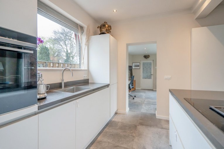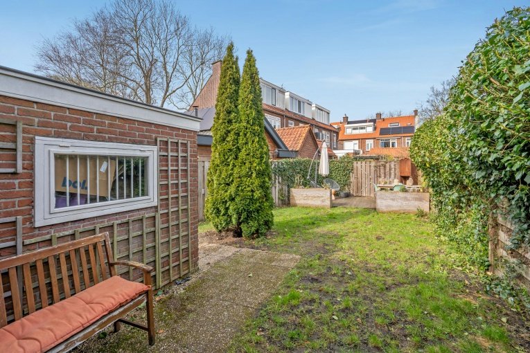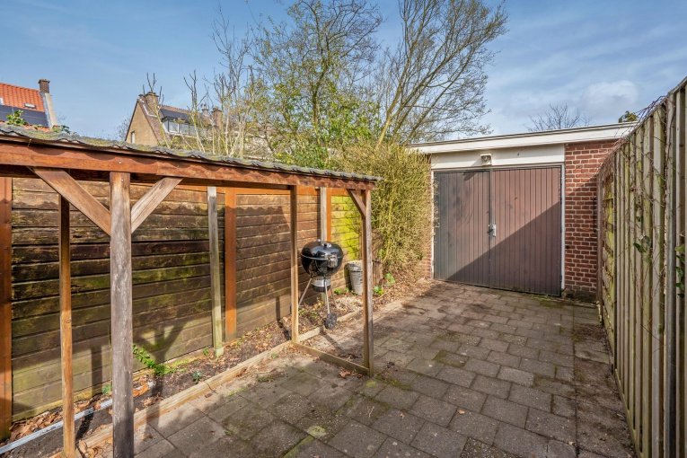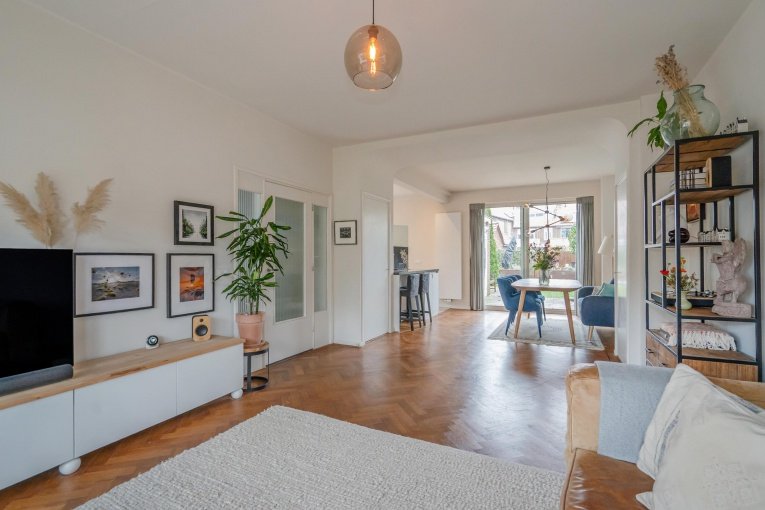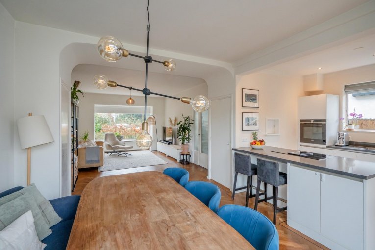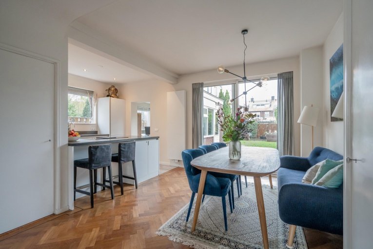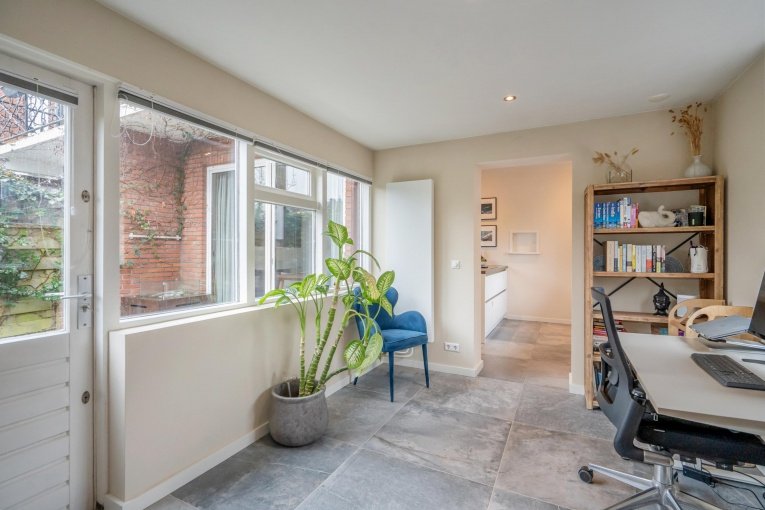Voortuin, entree aan de zijkant, tochtportaal, hal, modern vrijdragend toilet met fonteintje, ruime voormalig en suite woon-/eetkamer met ruime moderne open keuken met kookeiland voorzien van divers inbouwapparatuur waaronder een inductie kookplaat, oven, koel-/vriescombinatie en een vaatwasser. De gehele woon-/eetkamer is voorzien van een originele visgraat parket vloer. Voormalige bijkeuken is omgebouwd tot een ideale thuiswerkplek. Berging. Schuifpui naar de heerlijke achtertuin waar je heerlijke meerdere zitjes kunt creƫren. Achterom en de garage.