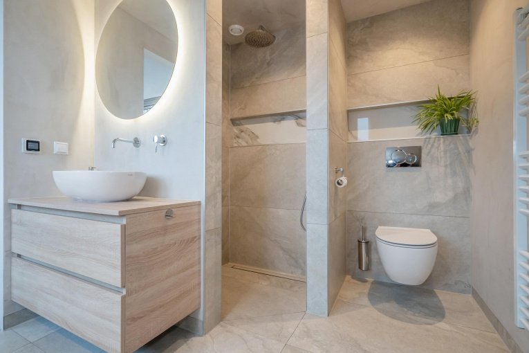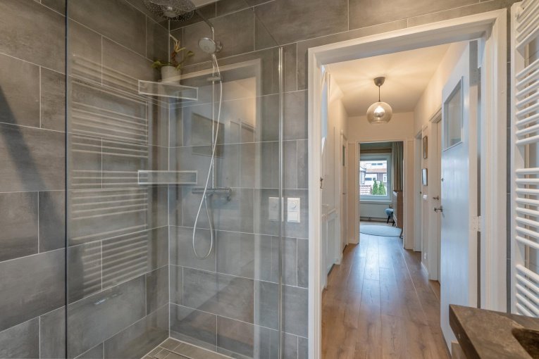 Overloop, modern vrijdragend toilet met fonteintje, moderne badkamer voorzien van dubbele wastafel en inloopdouche, achter zij slaapkamer, ruime achterslaapkamer met eigen balkon en ruime voorslaapkamer.