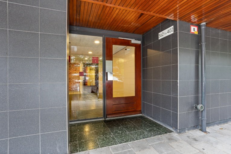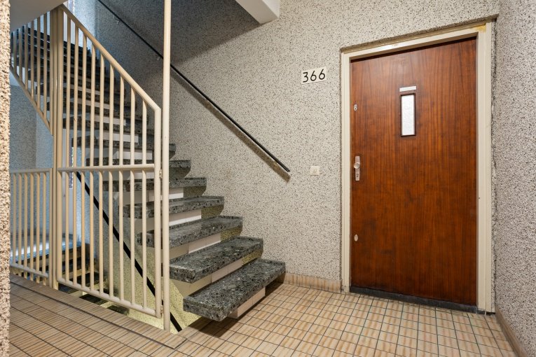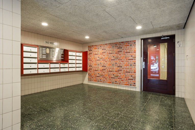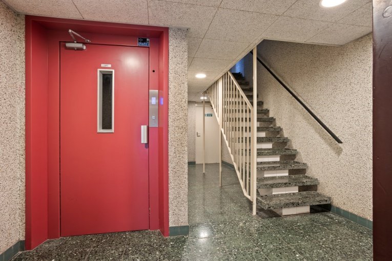 Entree op straatniveau. Centrale hal met bellen- en brievenbustableau, trappenhuis en lift.