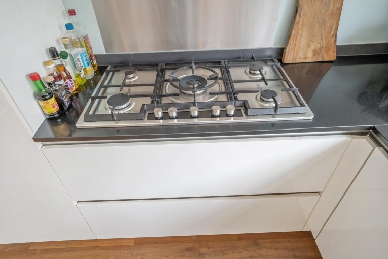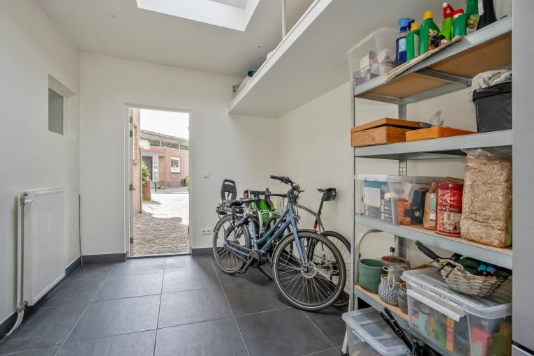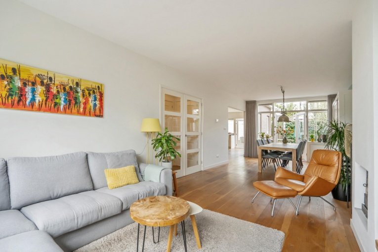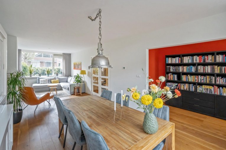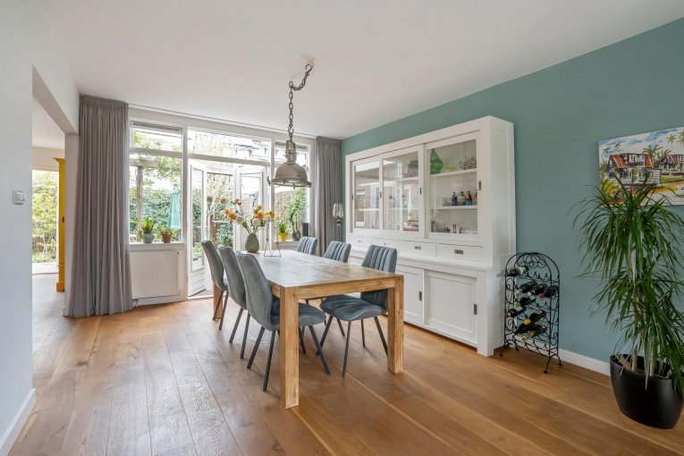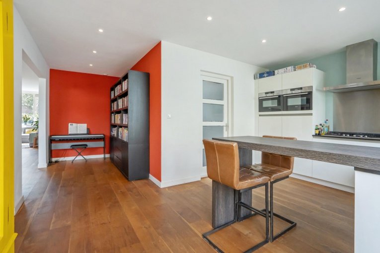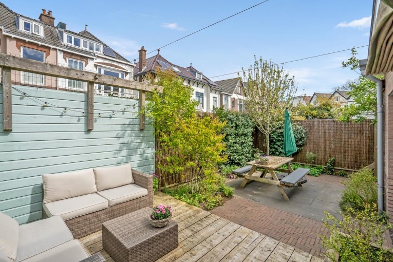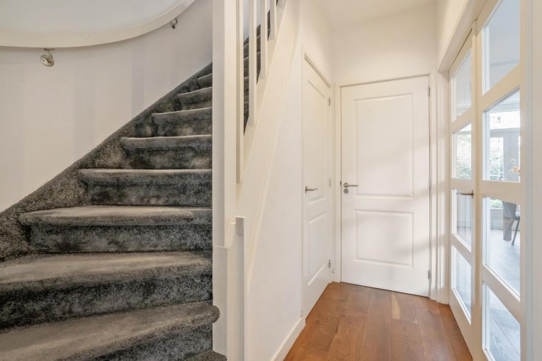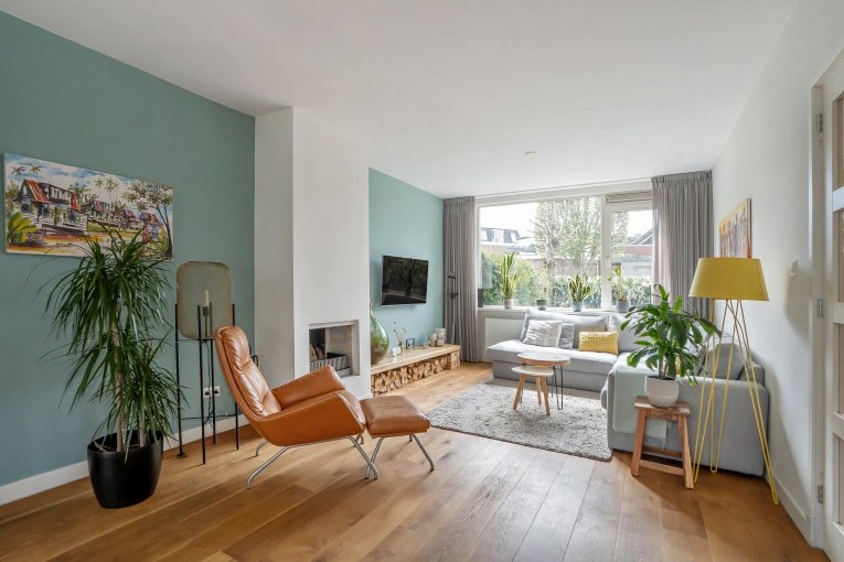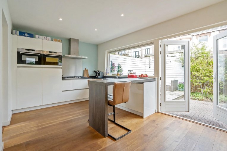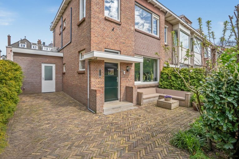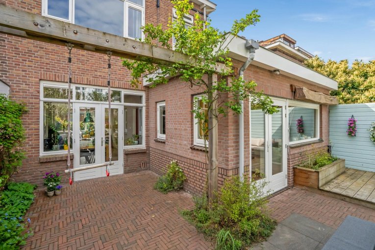 Zonnige voortuin, zijtuin met eigen oprit en parkeermogelijkheid. Entree woning: Vestibule met meterkast, gang met trapkast en modern vrijdragend toilet met fonteintje. Dubbele deuren naar de royale woon-/kamer met open haard en aan de achterzijde openslaande deuren naar de achtertuin. Aan de linker achterzijde bevindt zich de uitgebouwde moderne eetkeuken voorzien van een composiet aanrechtblad, gezellige eetbar en diverse inbouwapparatuur (5-pits kookplaat, afzuigkap, oven, magnetron, koelkast, vriezer, vaatwasser). Toegang tot de aangebouwde bijkeuken met dakraam, deze is ook bereikbaar vanaf de voorzijde van de woning. De gezellige stadstuin is vanuit de woonkamer en de keuken bereikbaar en is voorzien van twee terrassen.