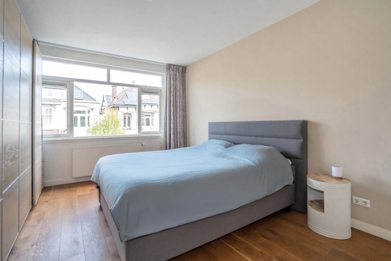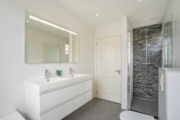 Eerste verdieping: Overloop. Voorzijkamer met extra daglichttoetreding door de hoekligging. Ruime voorslaapkamer. Master bedroom aan de achterzijde met inloopkast. Moderne badkamer met ligbad, inloopdouche, toilet, wastafelmeubel met dubbele wastafel en handdoekradiator.