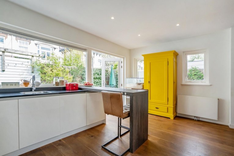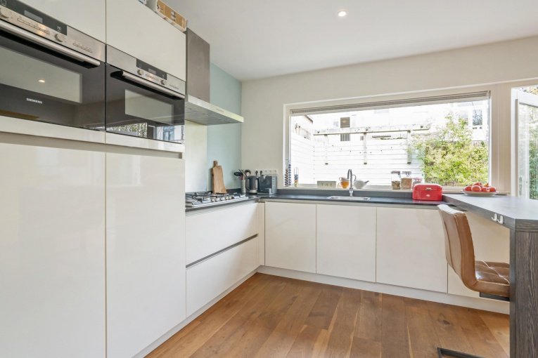 - De keuken is uitgebouwd aan de achterzijde en de bijkeuken aan de zijkant van de woning;