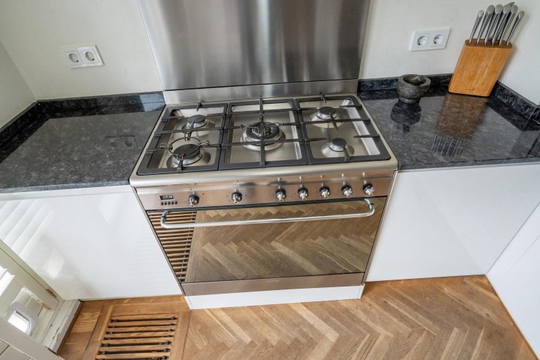 Entree woning, hal met meterkast, voormalig en suite woonkamer met ruime open keuken voorzien van diverse inbouwapparatuur zoals een Smeg 5-pits gasfornuis met brede oven (90cm), koelkast, aparte vriezer, combi-magnetron/oven en vaatwasser.