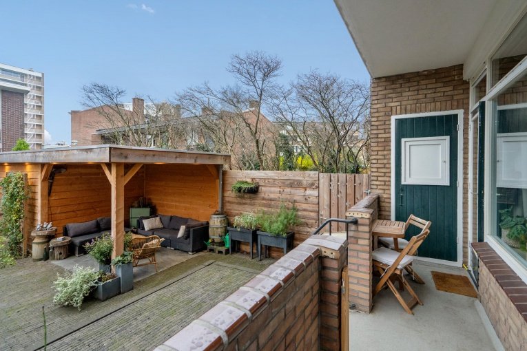 Modern en sfeervol 3/4 kamer (hoek) parterre appartement met balkon, royale achtertuin (ca. 98 m3) met fraaie blokhut met overkapping en berging in het onderhuis.