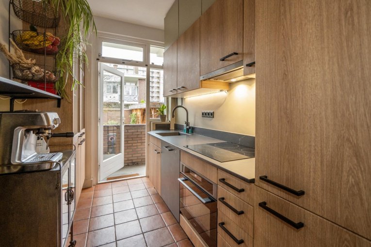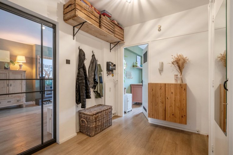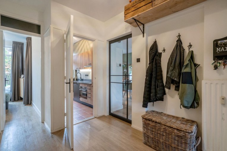 Entree appartement. Ruime hal met meterkast en modern vrijdragend toilet en fontein. Moderne badkamer met inloopdouche en wastafelmeubel. Royale doorgebroken woon-/eetkamer met open haard en extra lichtinval door de 2 zijramen. Via het balkon toegang tot de zeer grote en vooral zonnige achtertuin voorzien van een ruime en fraaie blokhut met overkapping. Moderne keuken met diverse inbouwapparatuur zoals inductiekookplaat, afzuigkap, combi-oven, koelvrieskast. Ruime achterslaapkamer en ruime voorslaapkamer.