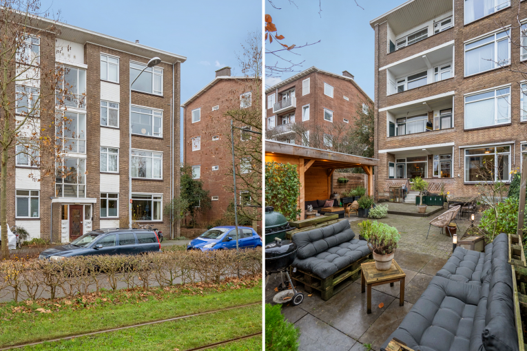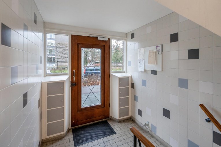 Afgesloten portiek op de begane grond met brievenbussen en bellentableau. Via het trappenhuis bereikt u middels enkele treden de verhoogde parterrewoning.