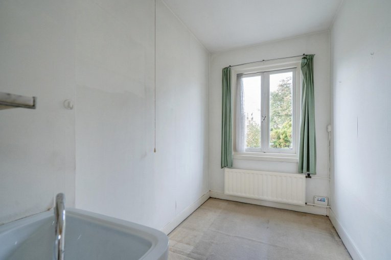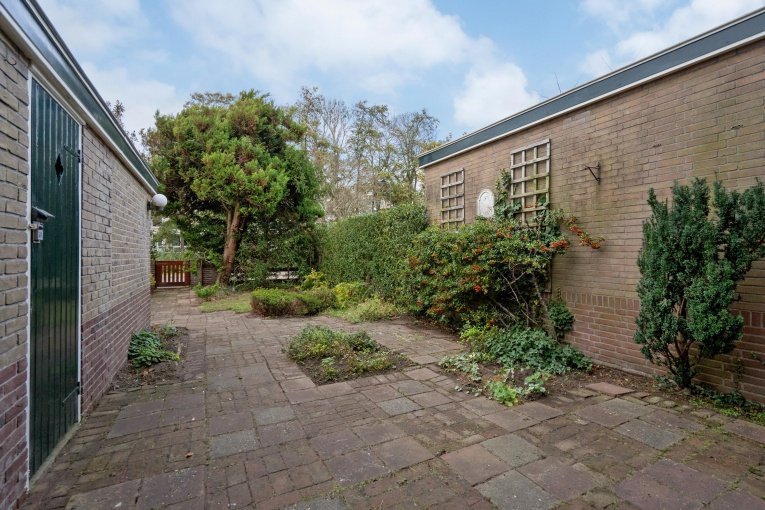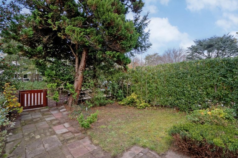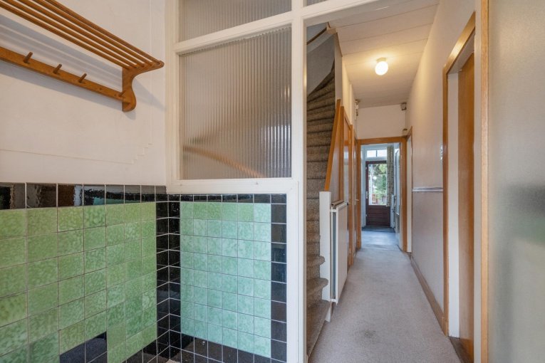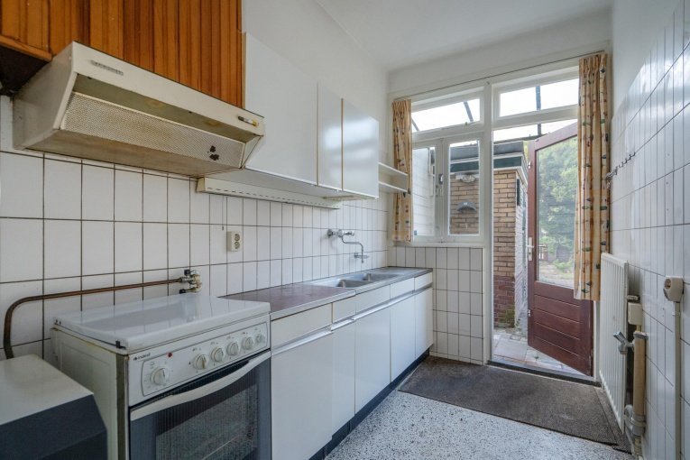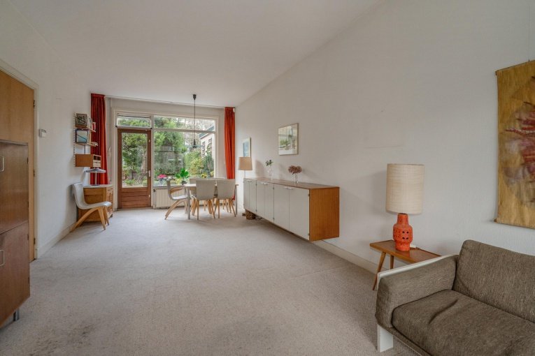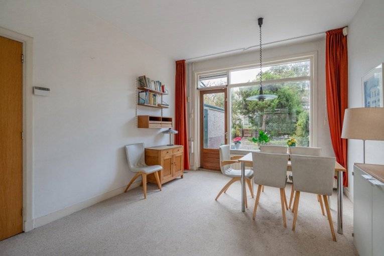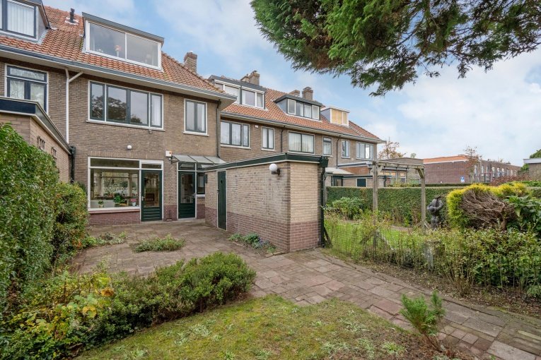Voortuin. Entree woning. Vestibule, voorzien van de originele tegels, met tochtdeur en de meterkast. Hal met trappenhuis, trapkast en toilet met fonteintje. Ruime woon-/eetkamer met toegang tot de ruime en zonnige achtertuin van circa 14 meter diep met stenen schuurtje. Aan de achterzijde is de eenvoudige keuken met de CV-gasketel en geiser en tevens toegang tot de achtertuin.