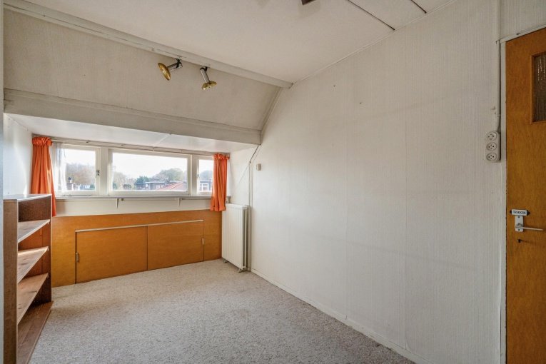 Overloop met luik naar de bergzolder. Ruime berging aan de voorzijde en berging aan de achterzijde. Eenvoudige douche met wastafel. Voorslaapkamer met bergruimte en dakkapel. Ruime achterslaapkamer met vaste kast en grote dakkapel.