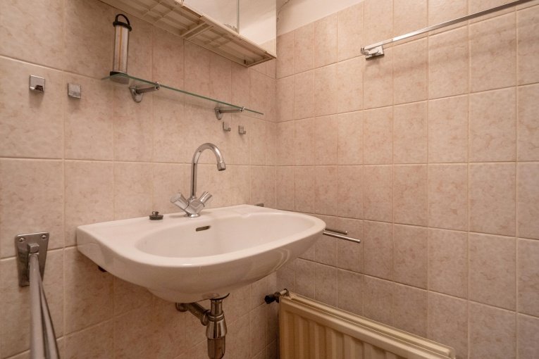 Overloop met 2e toilet met fonteintje. Ruime voorslaapkamer met inbouwkast en openslaande deuren naar het zonnige balkon. Eenvoudige badkamer met ligbad, wastafel en wasmachine aansluiting. Royale achterslaapkamer met wastafel en vaste kast en achterzijslaapkamer met eveneens een wastafel.