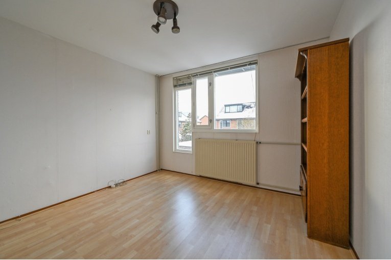 Ruime overloop, riante en lichte slaapkamer aan de voorzijde over de volle breedte van de woning, 2e slaapkamer aan de rustige achterzijde, studeer- of hobbykamer met opbergkasten, royale badkamer met ligbad, toilet, vaste wastafel en wasmachine aansluiting.