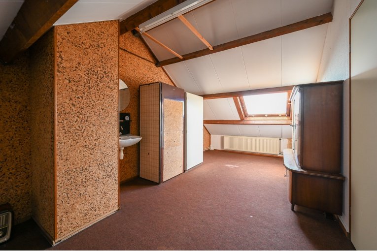 Overloop met veel bergruimte, opstelplaats CV-ketel, ruime zolderkamer over de volledige diepte van de woning met dakraam en vaste wastafel; uitstekend in te richten als extra slaapkamer.