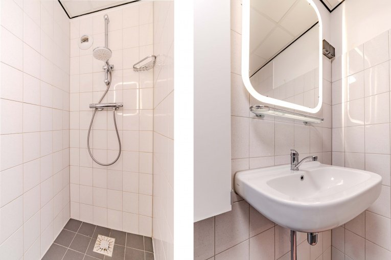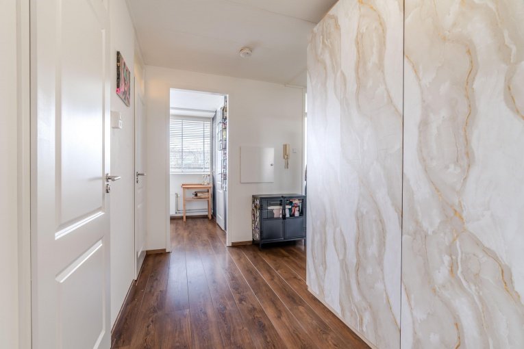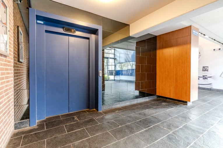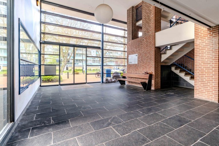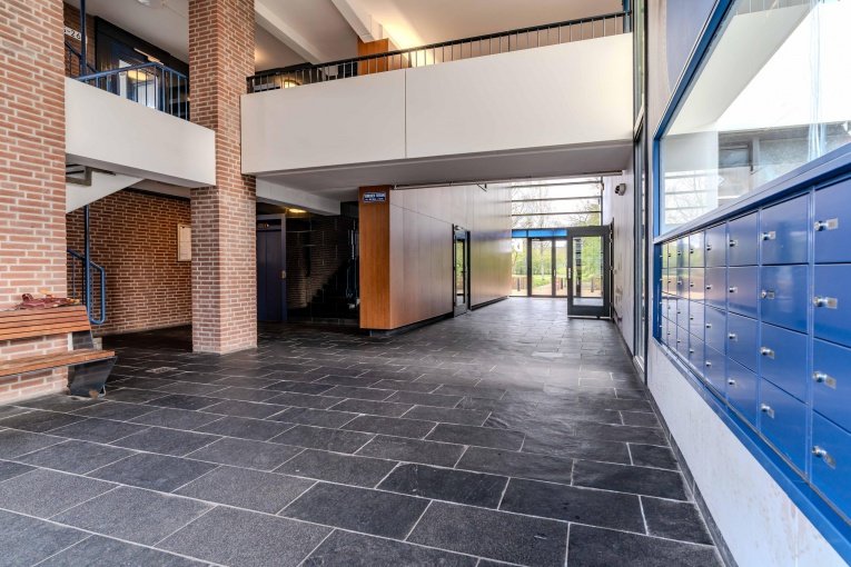 Fraaie, ruim en afgesloten entree met bellentableau, trappenhuis en lift; via de galerij komt u bij de appartementen.