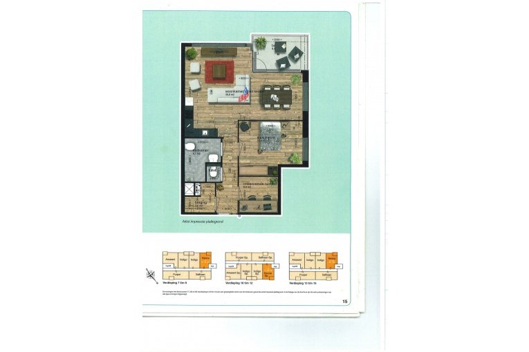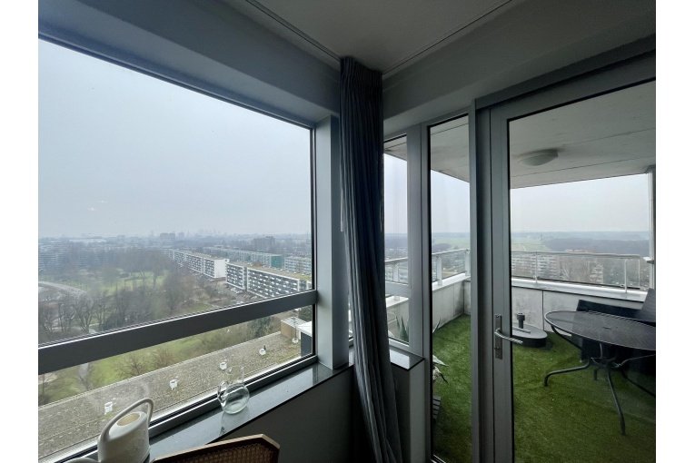 Indeling: gesloten entree met bellentableau, lift naar de 15e verdieping, entree appartement: gang met berging met opstelplaats voor wasmachine en droger, berg/studeerkamer, toilet met fonteintje, ruime badkamer met douche, vaste wastafel en 2e toilet, prachtige lichte woonkamer over de volle breedte met fraai uitzicht in 2 richtingen en een ruim terras op het Zuidwesten. De moderne open keuken is voorzien van diverse inbouwapparatuur.