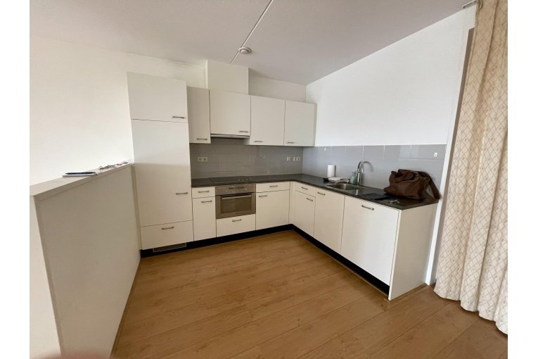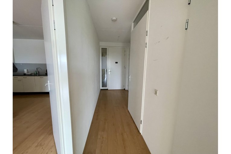 Indeling: gesloten entree met bellentableau, lift naar de 8e verdieping, entree appartement: gang met berging met opstelplaats voor wasmachine/droger, toilet met fonteintje, ruime badkamer met douche en vaste wastafel, ruime woonkamer met een ruim terras (ZW). De open keuken is voorzien van diverse inbouwapparatuur.