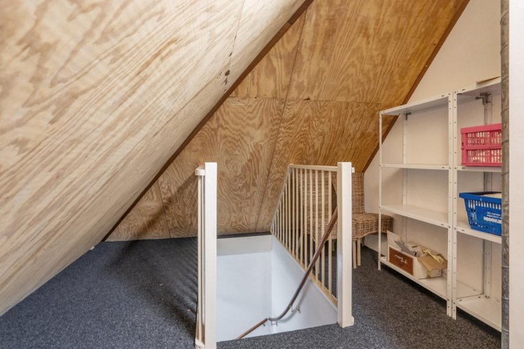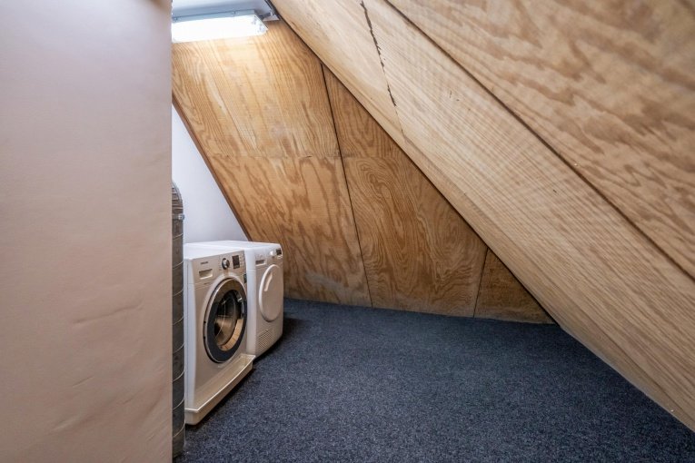 Trap naar bergzolder voorzien van opstelplaats wasmachine en droger.