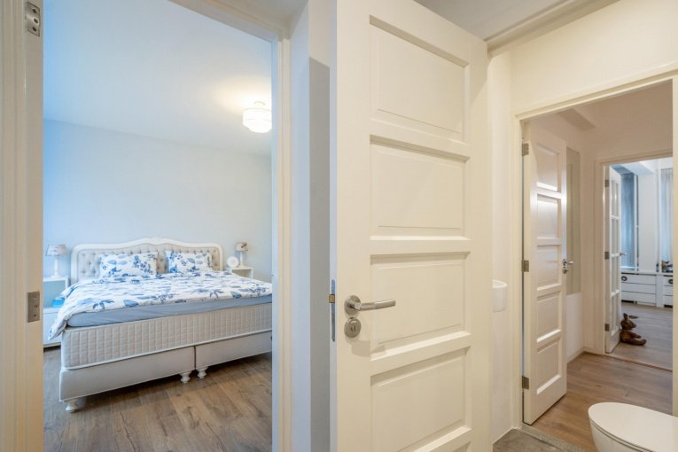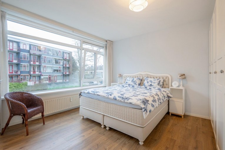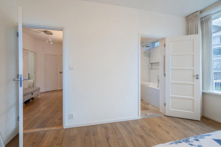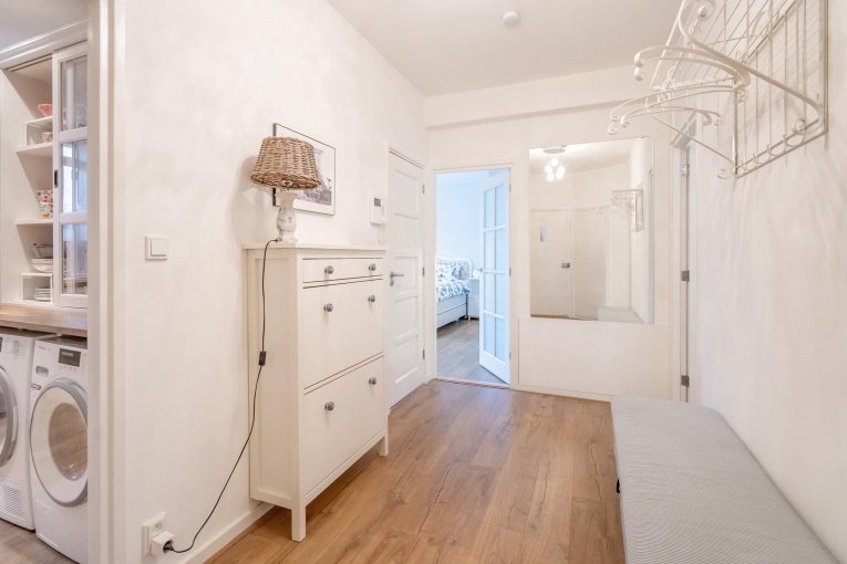Entree appartement. Hal met toegang tot alle vertrekken. Ruime en lichte L-vormige woon-/eetkamer met royaal voorbalkon (ZW). Het voorbalkon is toegankelijk via de openslaande deuren vanuit de woonkamer of de separate deur in de eetkamer waar je in de zomer heerlijk kan genieten van het groen om je heen. Riante slaapkamer aan de achterzijde met toegang tot de moderne badkamer voorzien van ligbad, douche en wastafel. Separaat toilet met fonteintje die via zowel de hal als via de badkamer te bereiken is. Moderne keuken met veel werkblad en diverse inbouwapparatuur (gaskookplaat, oven, afzuigkap, vaatwasser en koel-vriescombinatie), de wasmachine-/droger aansluiting en toegang tot het achterbalkon (NO). Voorslaapkamer welke ook ideaal te gebruiken is als thuiswerkplek.
