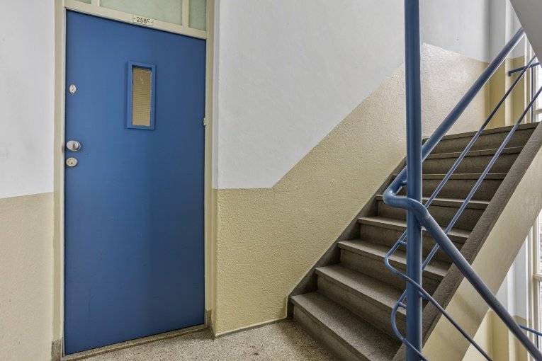 Entree op straatniveau met brievenbussen en bellentableau. Trap naar de 2e verdieping.