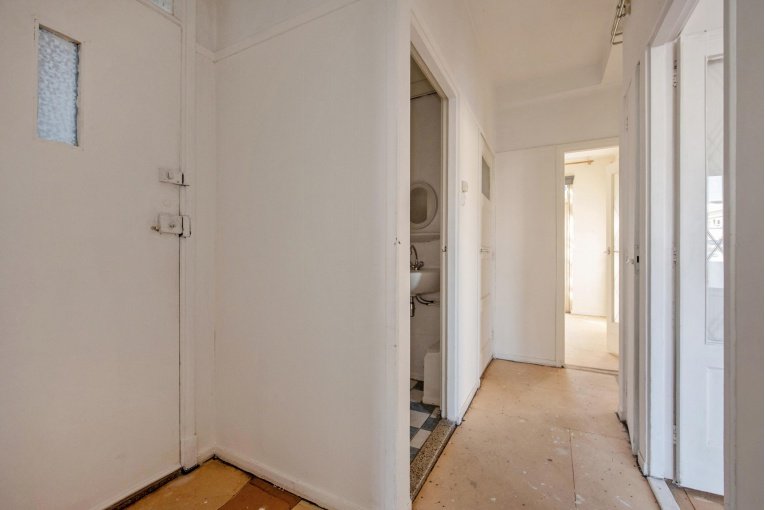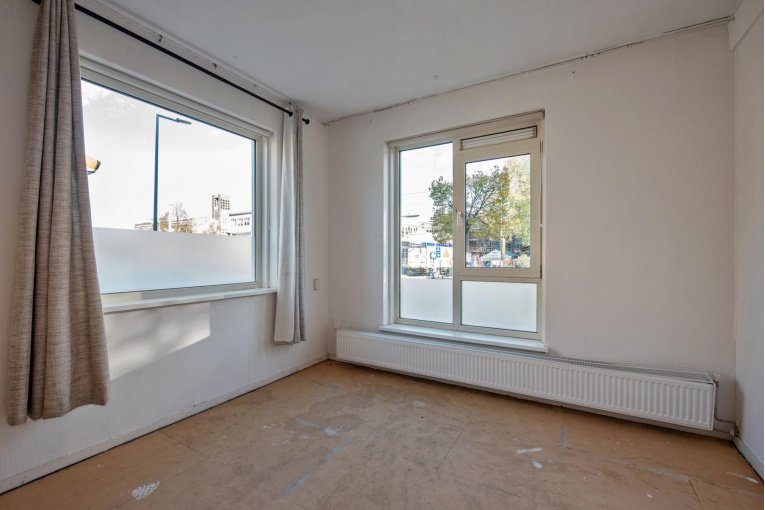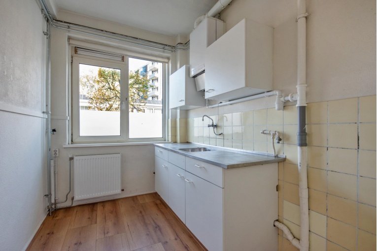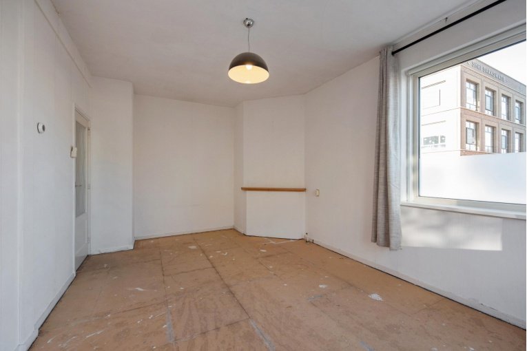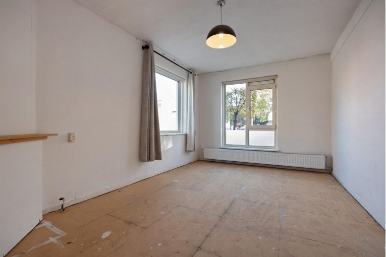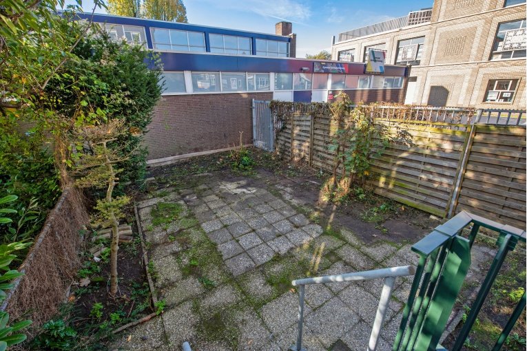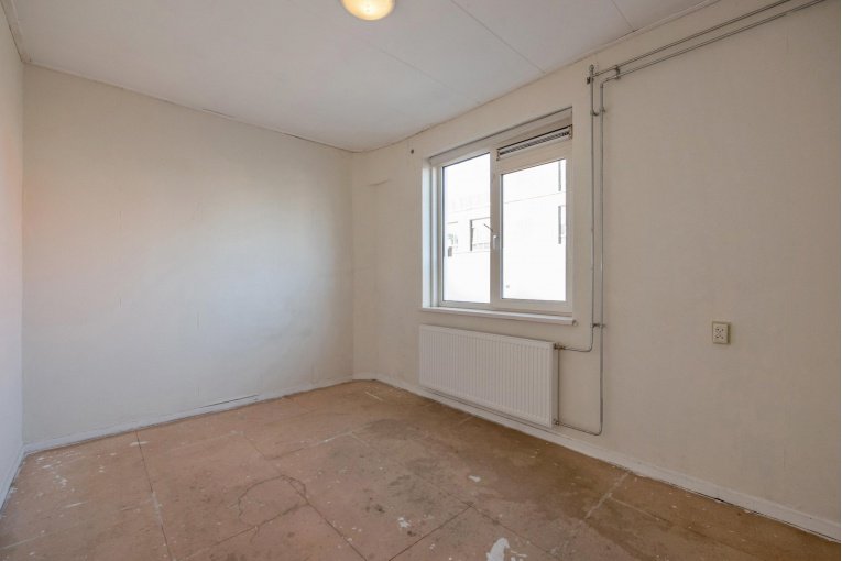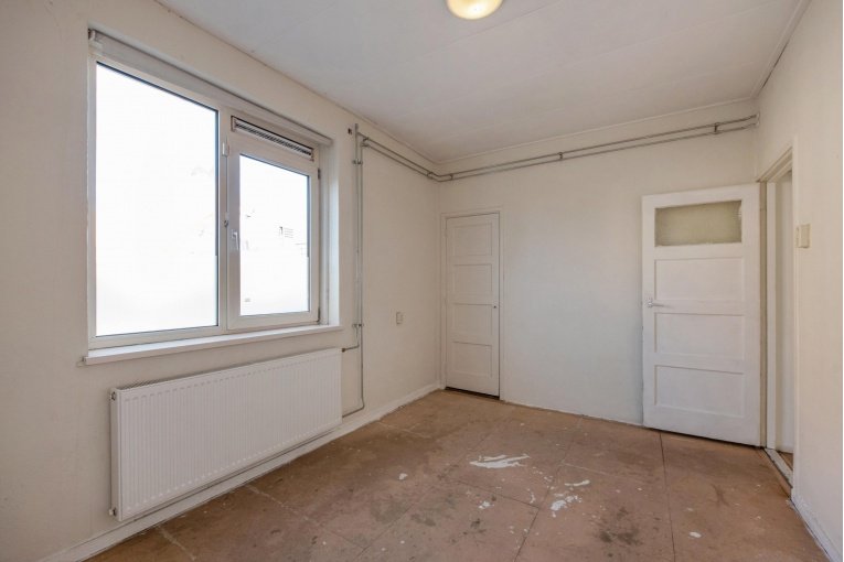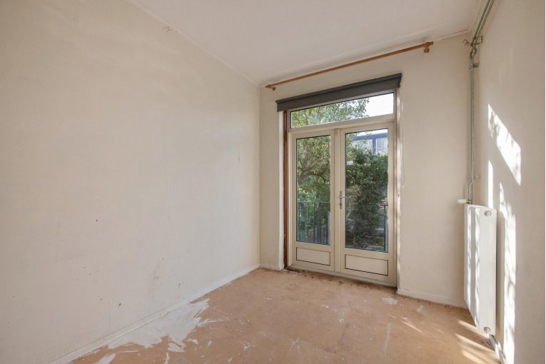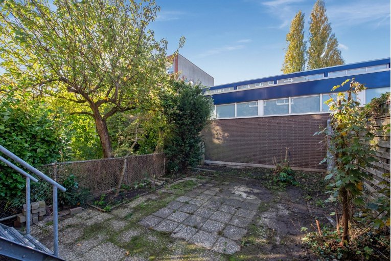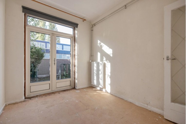 Entree woning, hal met meterkast, eenvoudig dichte keuken, lichte woonkamer, twee slaapkamers aan de achterzijde met achterbalkon en riante achtertuin, separaat toilet, eenvoudige badkamer met douche en wastafel.