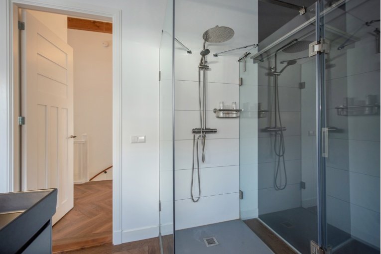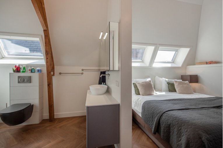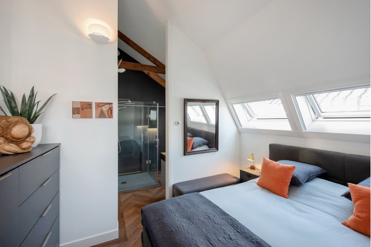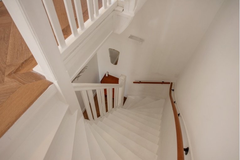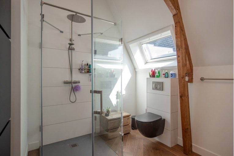 Apart vrijdragend toilet met fontein via overloop. Dan trap naar de tweede verdieping. Ruime overloop met daglicht. Voorheen 1 gigantische ruimte met ook veel hoogte. Geheel opnieuw en slim ingedeeld. Zo zijn er 4 slaapkamers, veel bergruimte en een tweetal moderne badkamers, elk met eigen toilet.