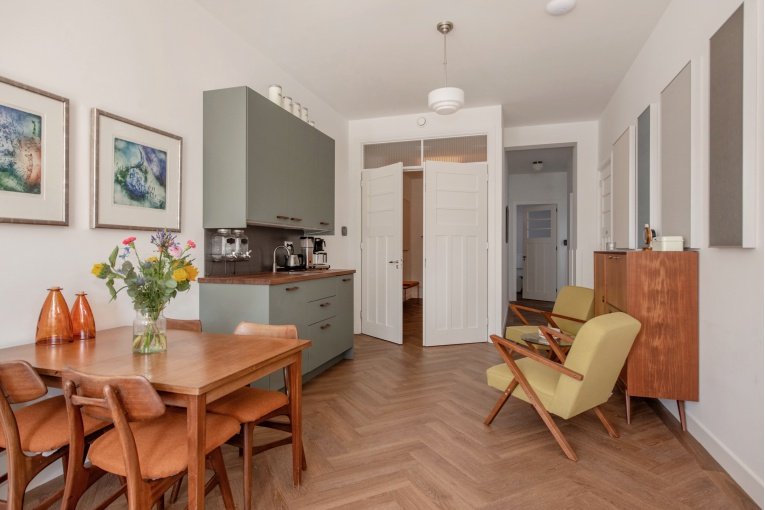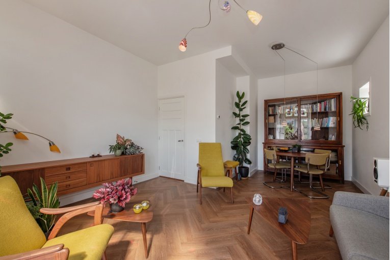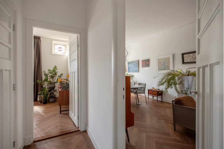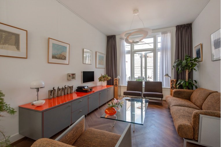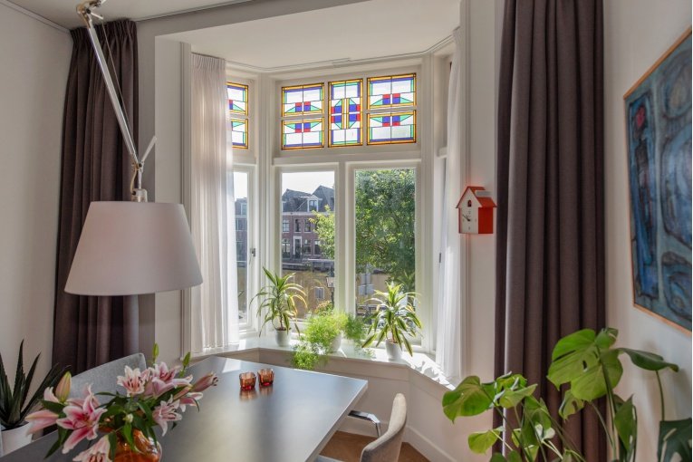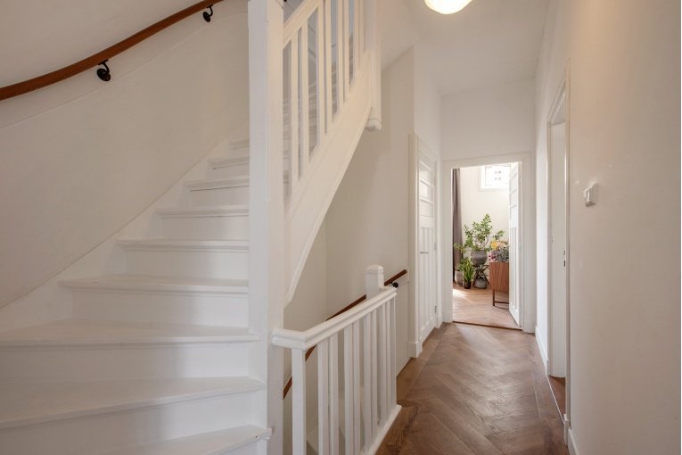 Fraaie trap naar de eerste verdieping; overloop. Tweetal woonkamers met elk fraaie Engelse Bay-windows (erkers) die leuke doorkijk geven over de Vliet. Aan de achterzijde treft u de moderne en goed ingedeelde L-vormige woonkeuken aan.