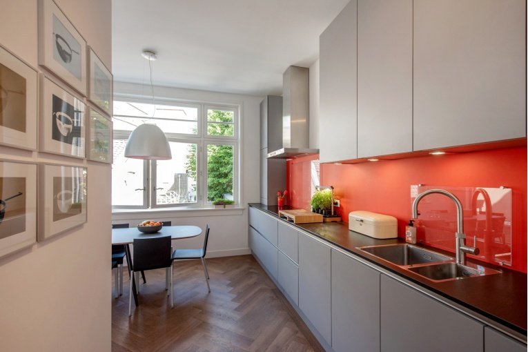 Met aan de lange wand voldoende lades en lang werkblad. Een 5-zone inductie kookplaat, wasemkap, vaatwasmachine, combioven, magnetron, oven, warmhoudlade, koelkast, separate vriezer, etc. Alles van AEG. Verder een Quooker met Cube, warm en koud water met of zonder bubbels.